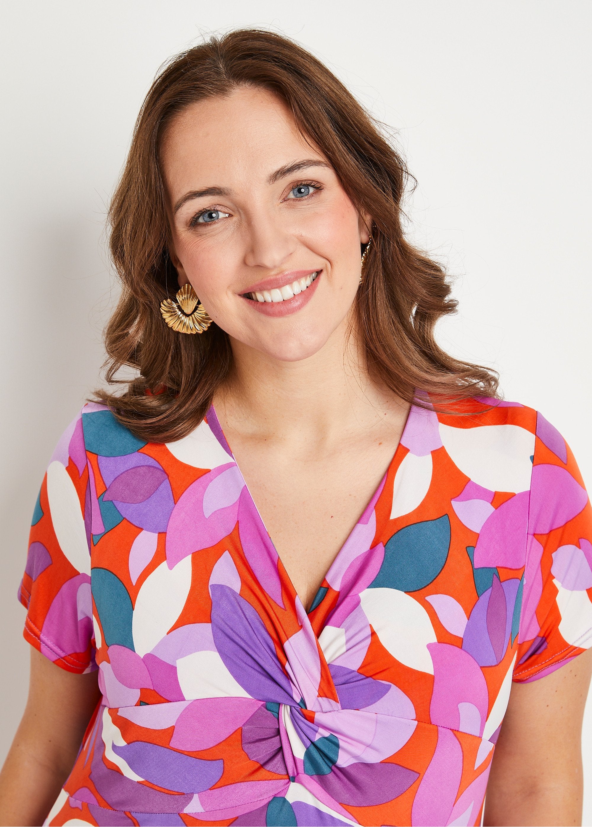 Between floral and graphic, the print enhances the style and structures the look of an original and feminine T-shirt. Its crossed V neckline in front is highlighted with a draped knotted effect. Its base is slightly flared under the front chest and back waist cutouts. Short sleeves. French made.
